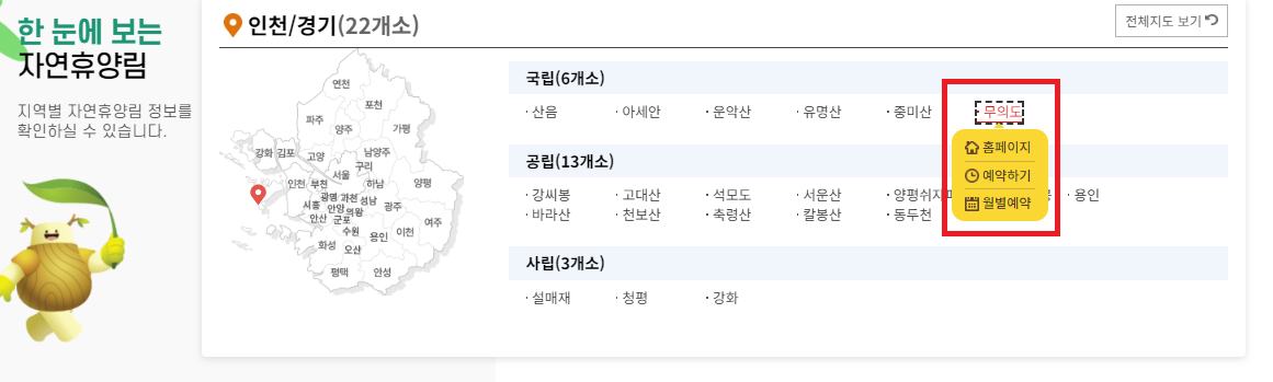 서울 근교의 인천/경기에는 22개소가 확인됩니다. 이중 국립으로 분류된 65개소 중 무의도를 선택했더니, 홈페이지/예약하기/월별예약 버튼이 확인되네요!