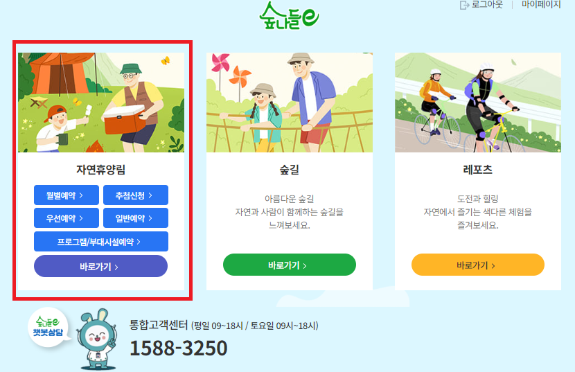 아래 이미지를 확인하시고 순서대로 이용하실 수 있고, 또는 각 이미지를 선택하면 예약 사이트(숲나들e)로 바로 이동합니다. 해당 사이트는 반드시 로그인 후 이용할 수 있기 때문에, 우선 회원가입부터 진행해 주세요!